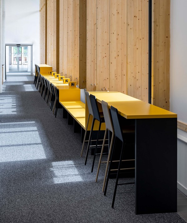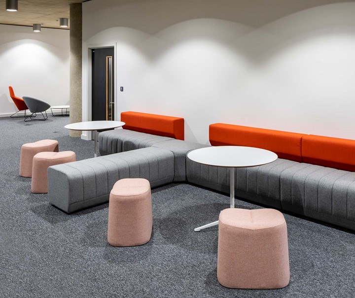 The Learning Hub area was designed to be the primary academic and social focus for the new campus, including the library and shared teaching spaces.  The variety of uses for The Learning Hub required a flexible solution that encouraged students and staff to work in the way that best suits their requirements. Connectivity was included in all settings to maximize space use.