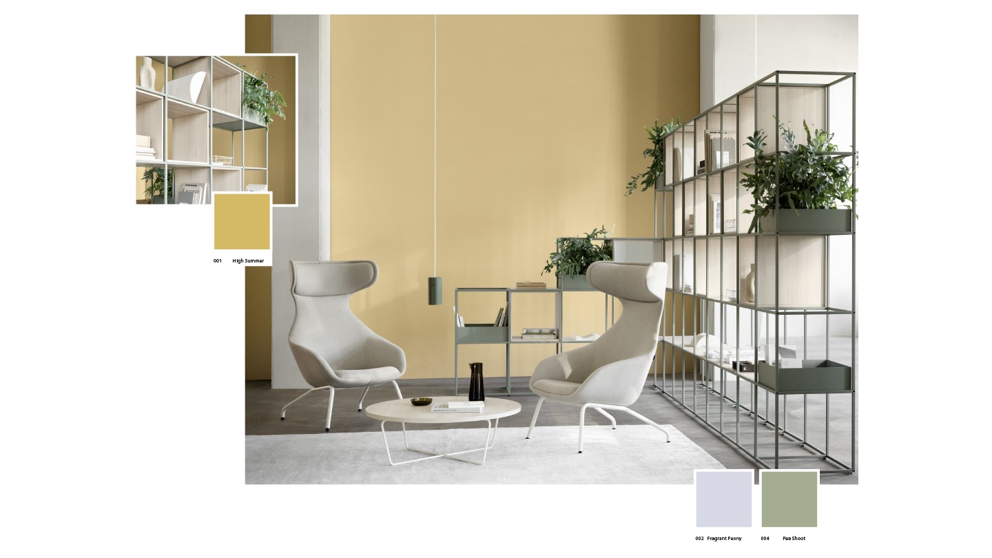 Entrances and lobbies are the first space people will encounter when entering a building. First impressions count, which means it is essential to set the right atmosphere in these areas. Depending on what your business or brand stands for, you might want to create an uplifting atmosphere and if so, then brighter tones like the bright yellow High Summer or the violet Fragrant Peony will be the perfect option. On the other hand, if you want to create a more down-to-earth and trustworthy welcome, then muted shades of blues like Ocean Stone, greens like Pea Shoot and delicate tones like Sweet Embrace may be best.