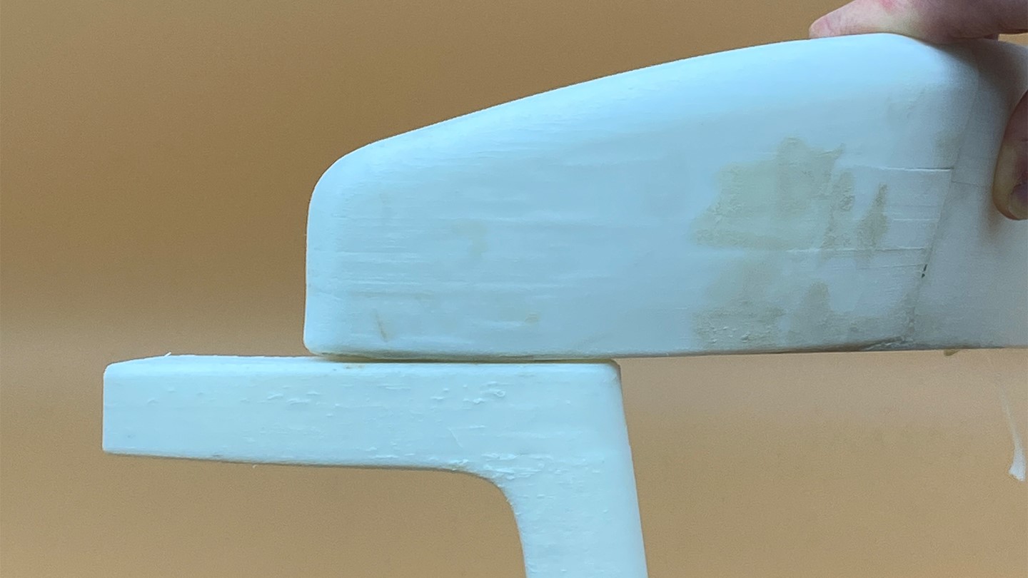At this stage the 3D CAD is already at about 90% the final chair but the last 10% requires patience. First thing was to 3D print a 1:5 scale model to review general proportions, then make a loose 1:1 blue foam model the arm / leg / back junction.