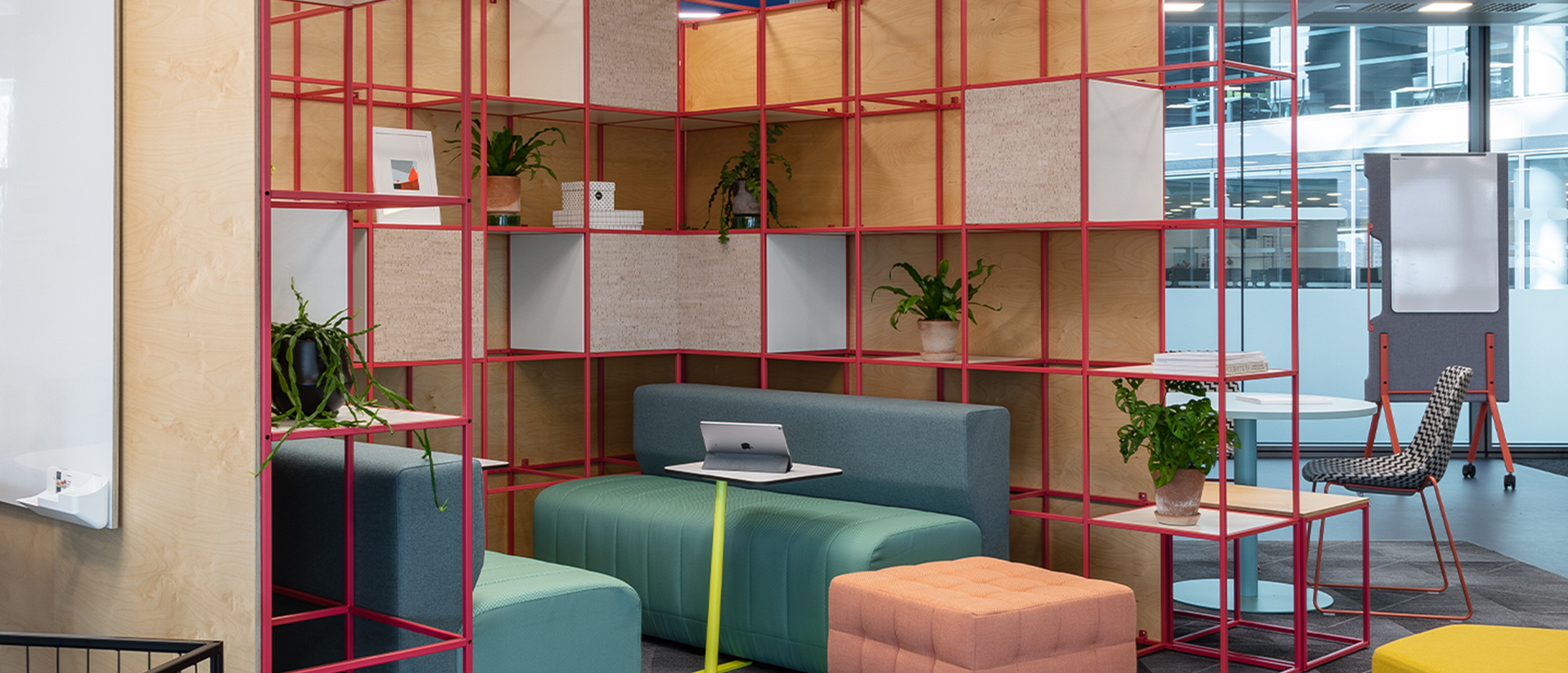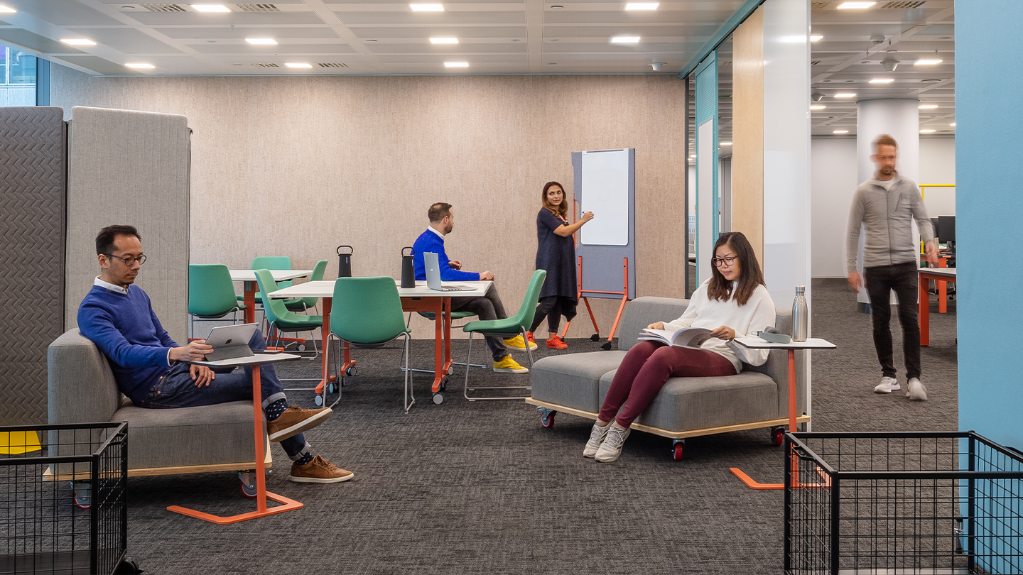 CC We tried to stay clear of trends as we wanted to deliver a space that would stand the test of time and age well. We were inspired by principles of modularity to support future reuse and change of function. The colour palettes were a fresher ‘zingier’ take on the corporate primary and secondary colours that added a lot of freshness and vibrancy to the work areas and landing zones. Colour was used in quite a functional way to help modulate the space and create intuitive transitions.